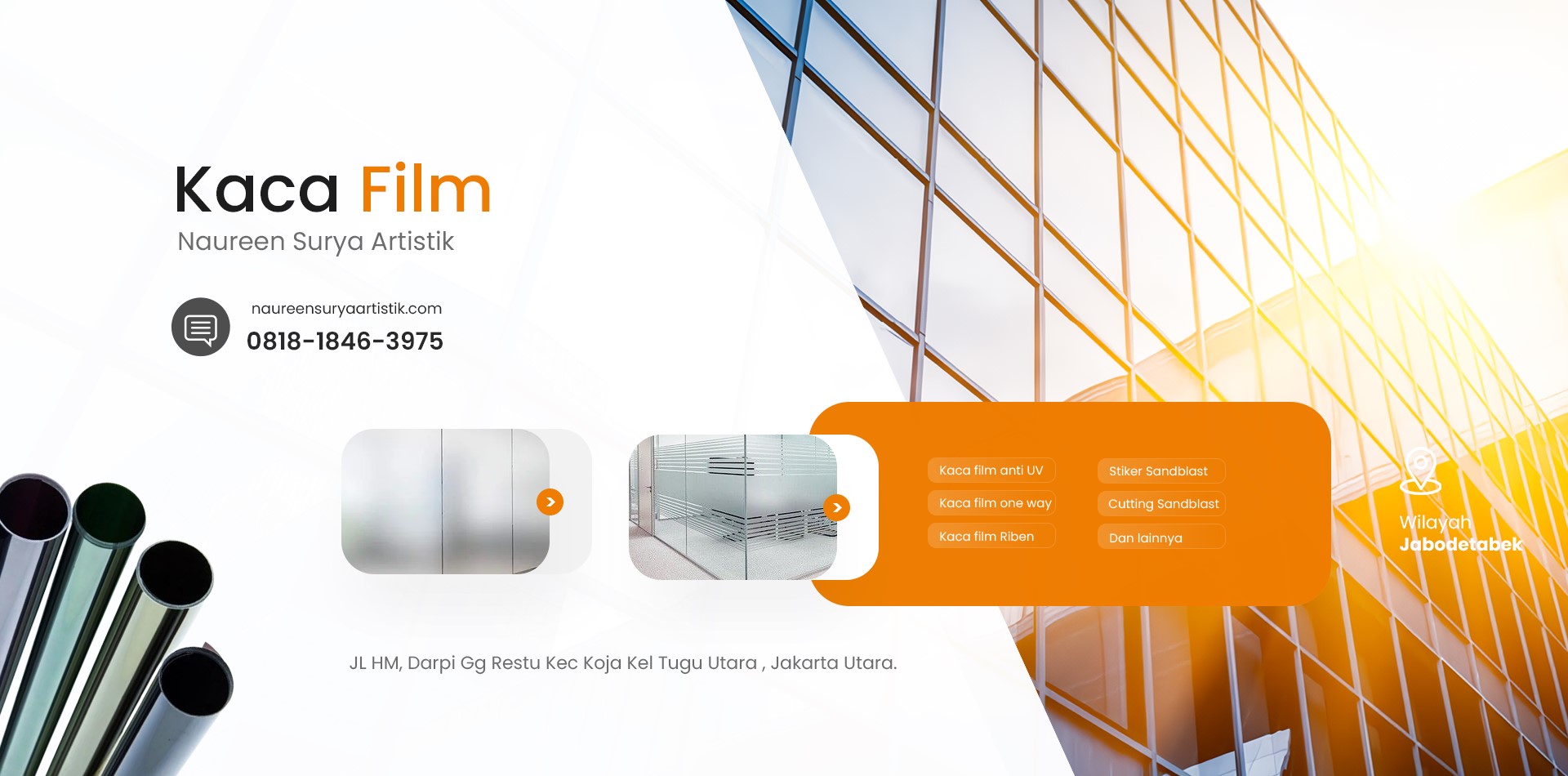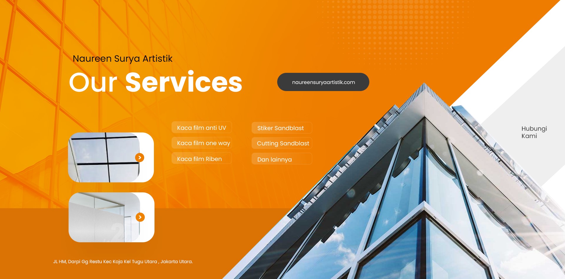 Selamat datang di Naureen Surya Artistik, pusat layanan kaca film gedung, sticker sandblast, dan cutting sticker di Jakarta dengan kualitas terbaik, desain elegan, dan pengerjaan profesional.